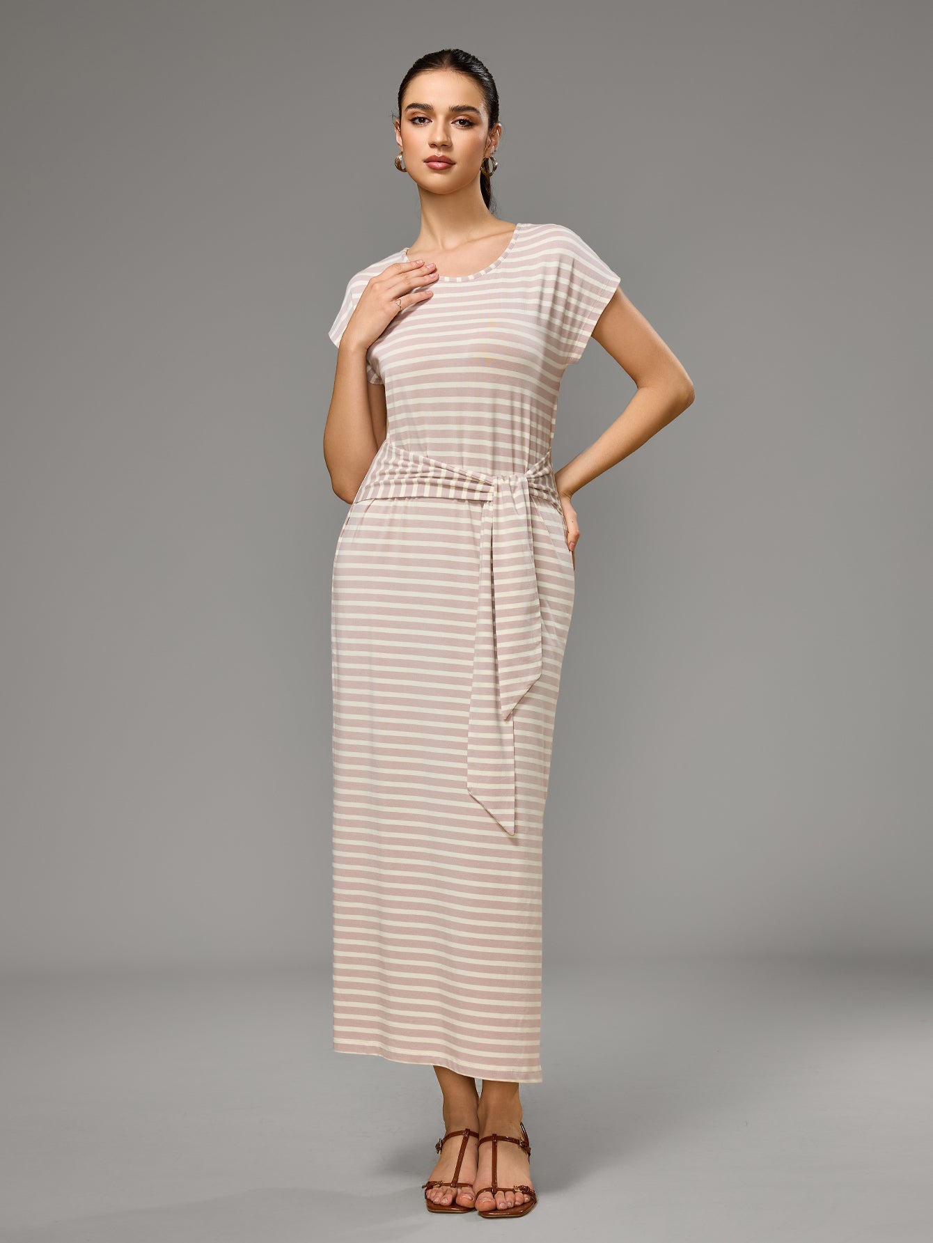 ♥ SUITABLE DESIGN STYLE & COMFORT - Chic, breathable, and effortlessly elegant—this striped belted maxi dress is your new go-to for elevated summer style. Crafted from a luxurious blend of 47.5% rayon, 47.5% cotton, and 5% spandex, it offers the perfect combination of softness, stretch, and breathability, making it ideal for warm-weather wear. Comes with a self-tie belt to define the waist or wear it loose for a relaxed look.
