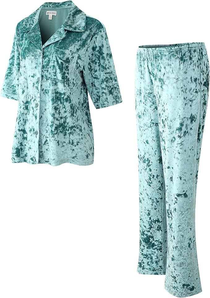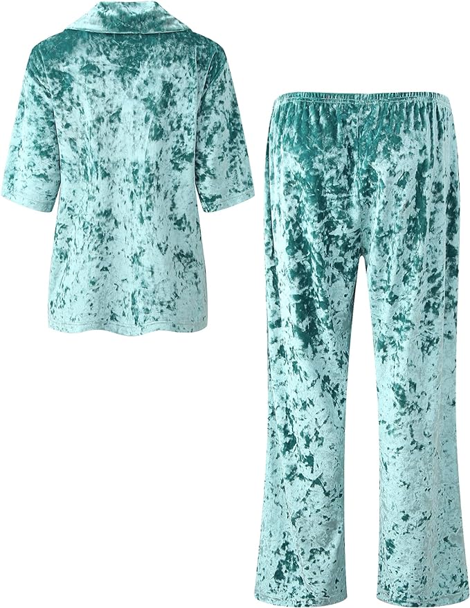 - ♥ SUITABLE DESIGN STYLE & COMFORT - The Cozy sleepwear pajama set features a 3/4 Sleeve notch collar velvet material, chest pocket and adjustable Long Pants elastic waistband for a better and relaxed fit. These pajamas are loose to allow airflow to keep your body cool and dry throughout the night.